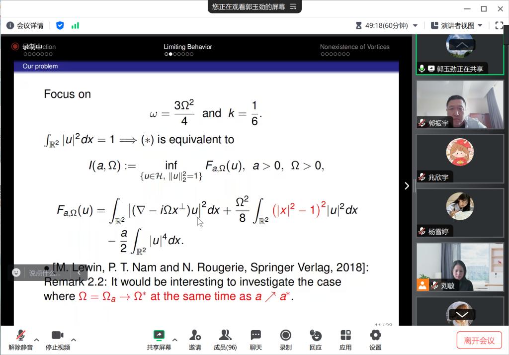在这次报告中,郭玉劲教授重点介绍了以一定速度限制在旋转非谐阱中的吸引玻色气体的基态,并证明了:对于任意给定的速度,基态的存在和不存在性与非旋转情况下的基态完全相同。同时,郭教授进一步向大家展示了当旋转速度趋近于无穷大时基态的极限轮廓。